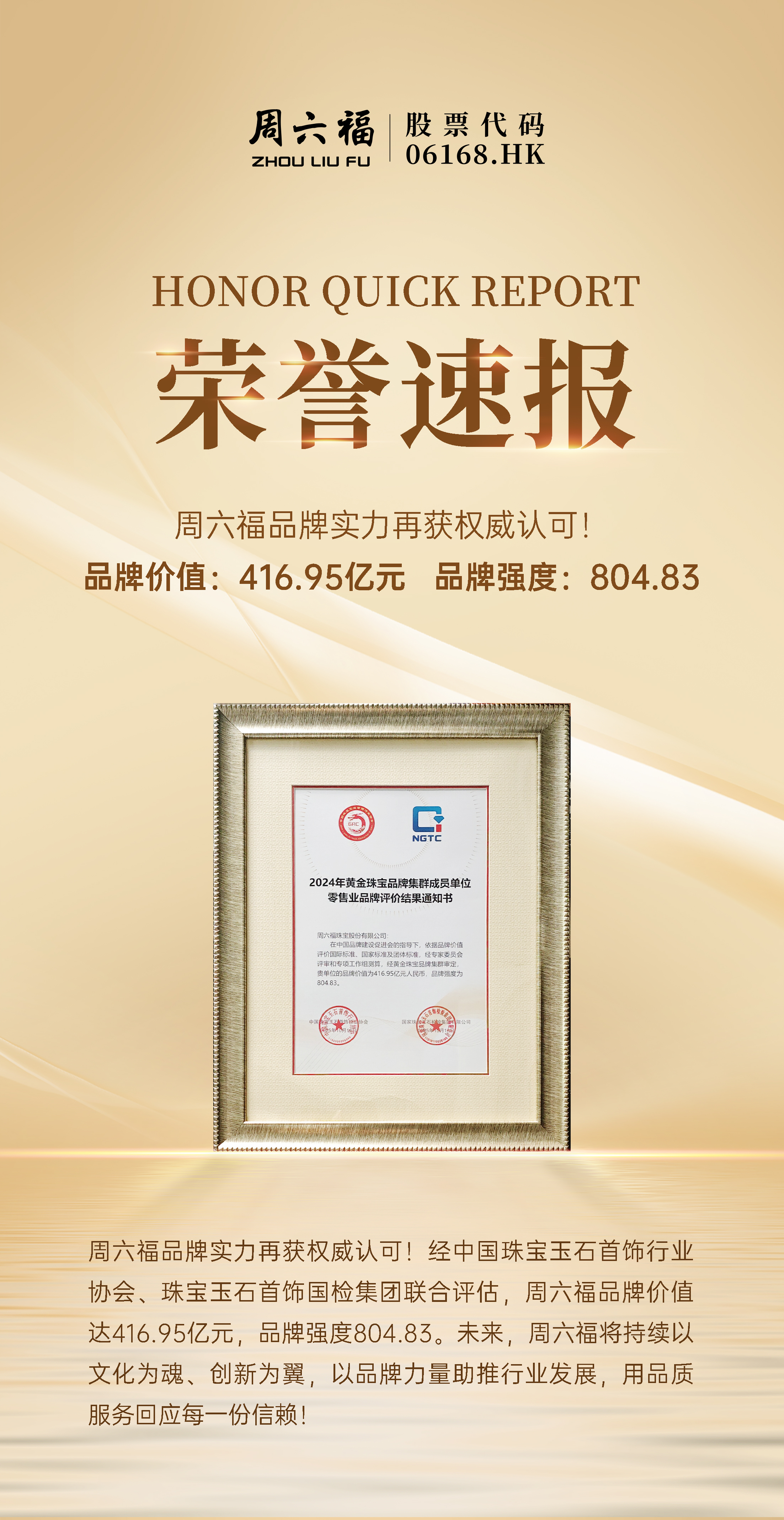 荣誉速报丨周六福品牌价值达416.95亿元!